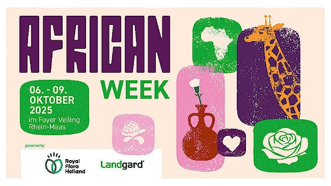 Sehr geehrte Kunden, wir laden Sie herzlich zur ersten African Week von Veiling Rhein-Maas ein! Vom 6. bis 9. Oktober 2025, jeweils von 7:30 Uhr bis 14:00 Uhr (Donnerstag bis 12:00 Uhr), verwandelt sich unser Foyer in Straelen-Herongen in eine farbenprächtige Ausstellungsfläche. Veiling Rhein-Maas präsentiert hier aktuelles aus den Sortimenten der Rosen- und Sommerblumenproduzenten aus Afrika unserer beiden Muttergesellschaften Royal FloraHolland und Landgard. Die präsentierten Produkte sind über die Vermarktungskanäle von Veiling Rhein-Maas und auch über Floriday verfügbar.